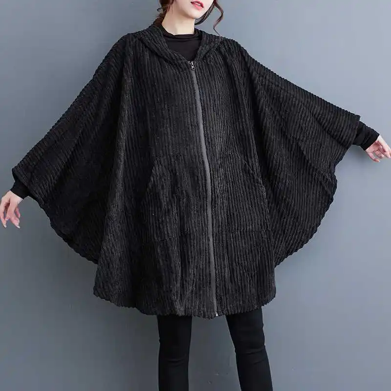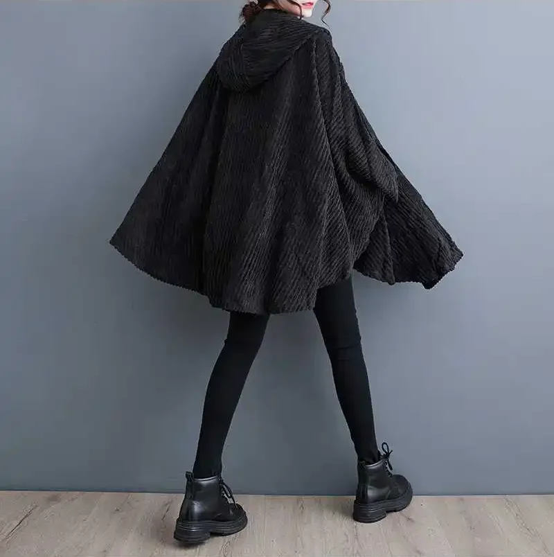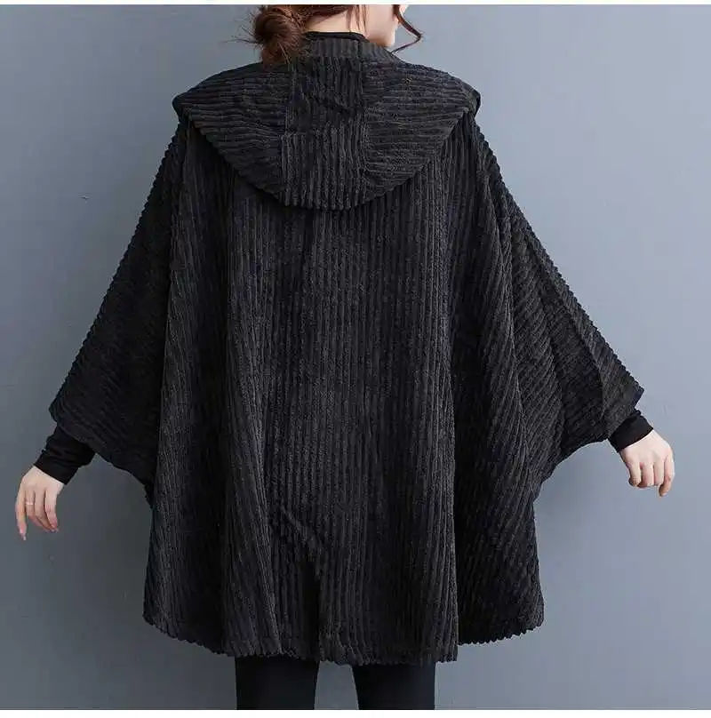 Découvrez le manteau velours côtelé femme, chaud, doux et tendance. Coupe élégante, manches chauve-souris et capuche protectrice. Idéal pour un hiver stylé!