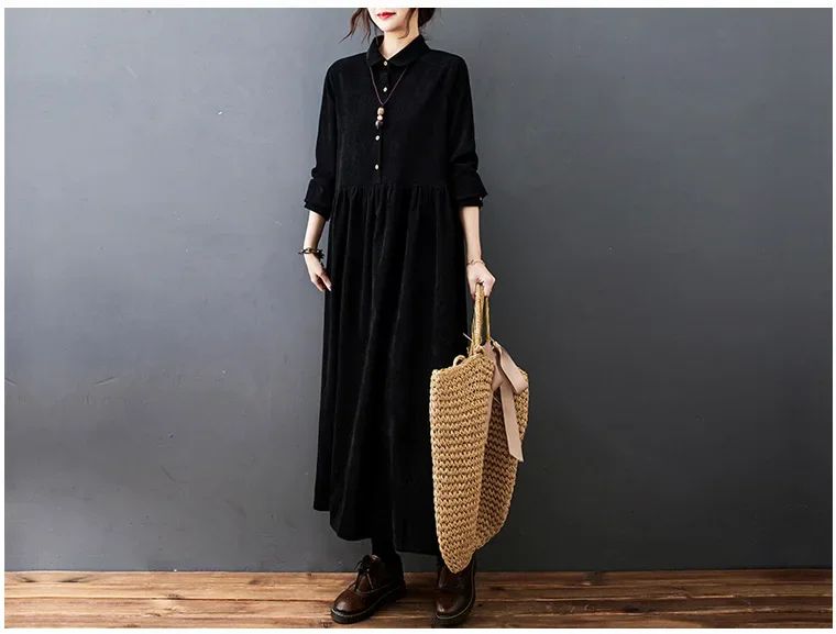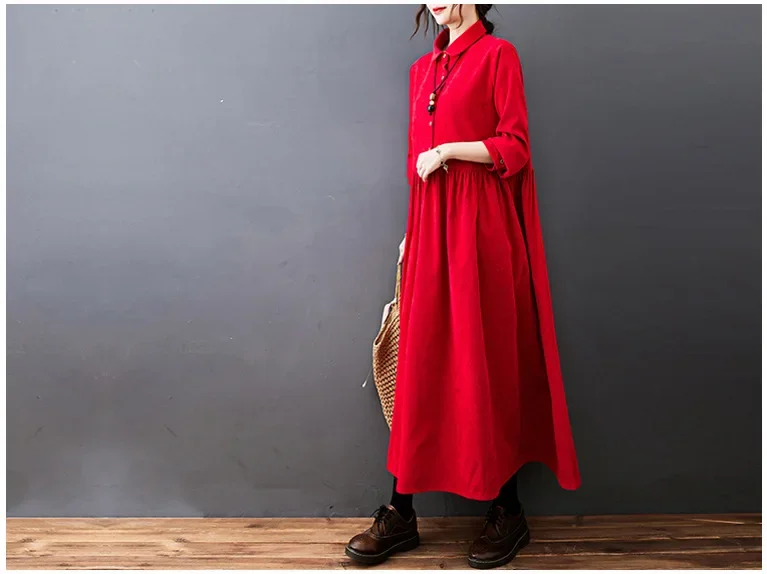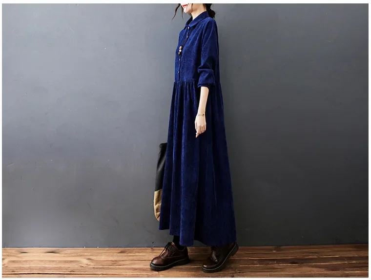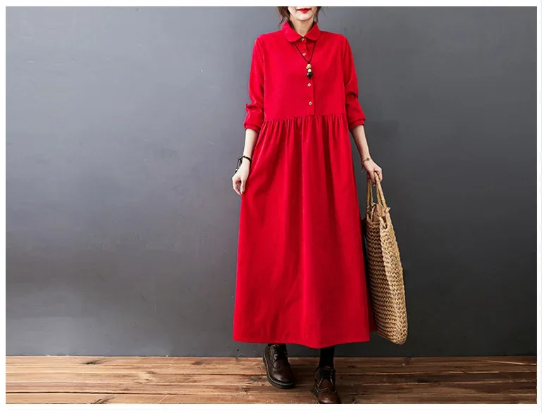 Robe velours côtelé longue, disponible en bleu, rouge ou noir. Coupe ample pour un confort optimal. Élégante et facile à porter au quotidien.