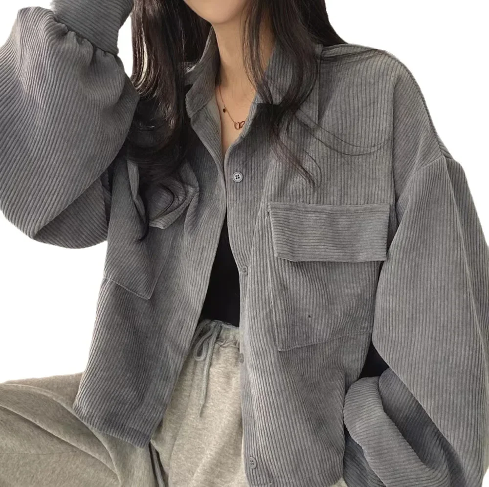 Veste velours côtelé femme, coupe ample et confortable. Disponible en noir, gris et kaki. Idéale pour la mi-saison. Style tendance et intemporel.